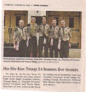 June 2019 – Eagle Scouts – Jonathan Sumner, Thomas Finan, Tim O’Connor, Connor Courtney, and Trevor Hintz